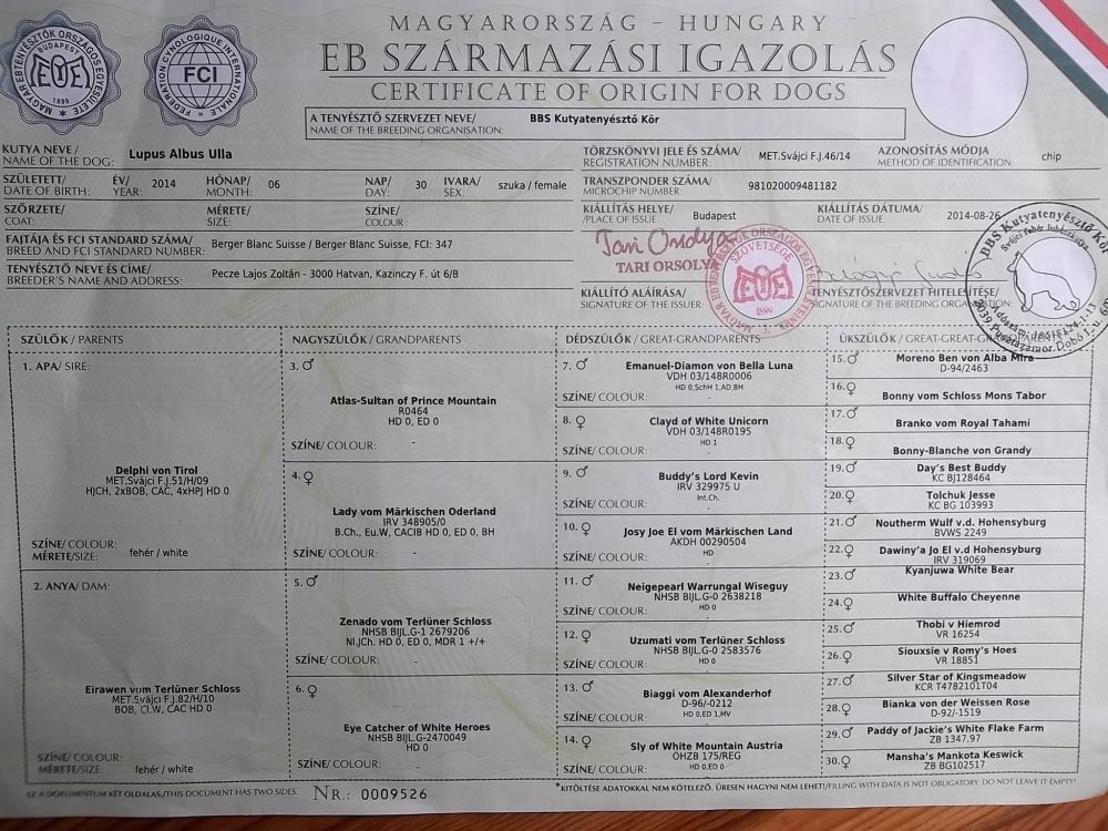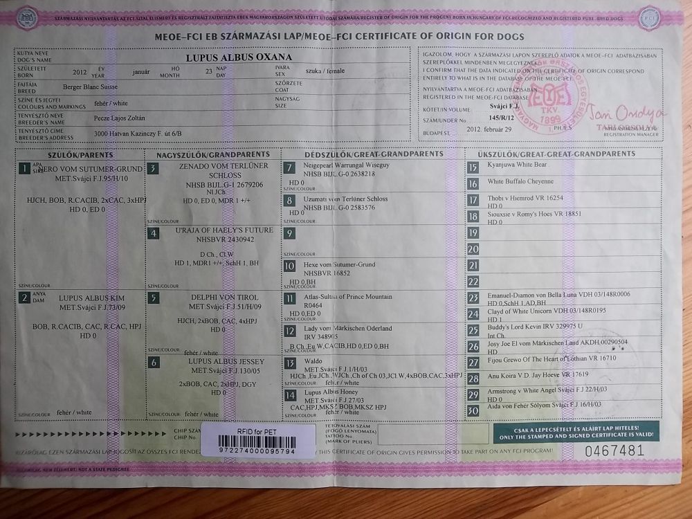 Kiállítási eredmények: Kitűnő (Excelent), Res. CAC